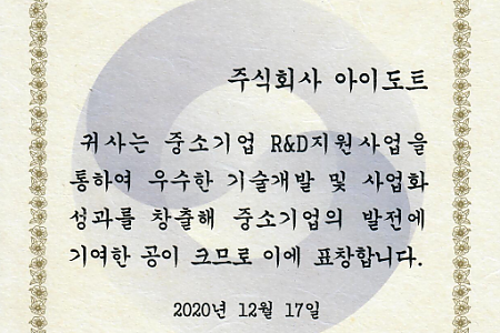 아이도트는 인공지능 기반 자궁경부암 스크리닝 솔루션의 기술개발 및 사업화의 공로를 인정받아 2020년 중소벤처기업부 장관표창을 수상하였다.이로써, 올해 아이도트는 스마트대한민국 기…