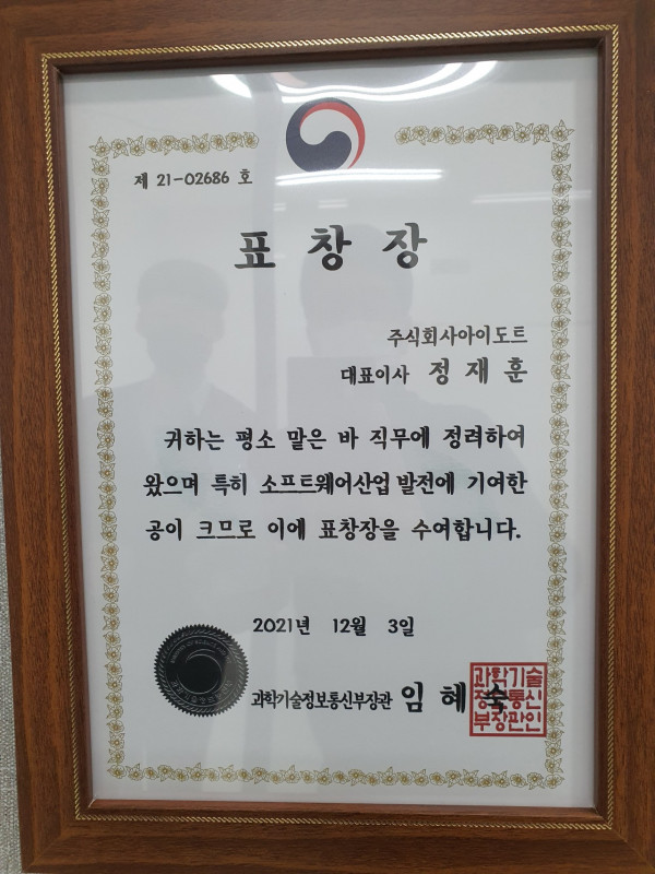 아이도트 과학기술정보통신부 장관 표창 수상 (2021.12.03)